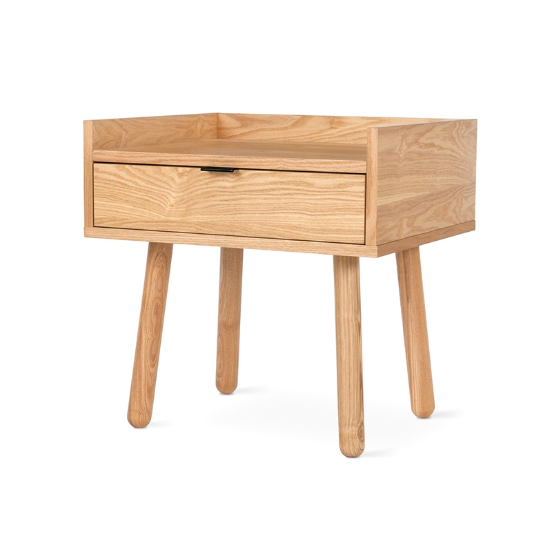 Rounding out the Scandinavian-influenced Mimico Series, the Mimico End Table works perfectly beside a sofa, a chair, or flanking a bed. The table features a convenient single drawer, with contrasting hardware in a brass or black finish. The top surface is uniquely enclosed on three sides, while the turned legs are made of solid wood.