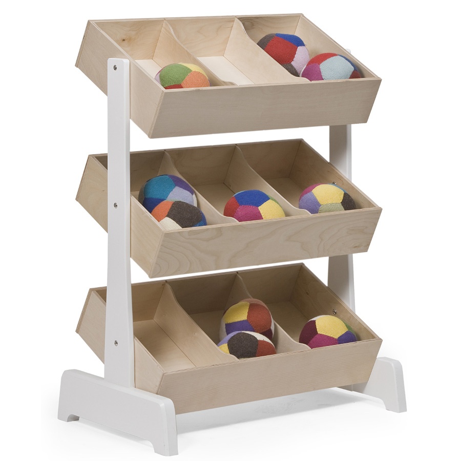 Toy Store by Oeuf.The Toy Store is an innovative storage system designed to make organization as easy as 1, 2, 3. The three tiers of storage bins are ideal for books and toys. With the option for the bins to be positioned flat or tilted, the resulting easy access makes clean-up a breeze. Even the kids will want to pitch in and help! The bin dividers are removable so you can store a multitude of items of varying sizes – from the smallest Lego to oversized puzzles and everything in between. Available in birch and walnut finishes, with a white frame.