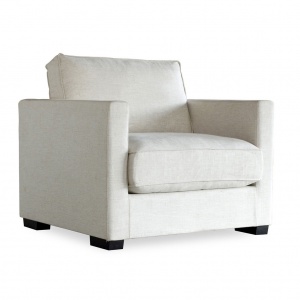 Richmond Chair by Gus Modern. A comfortable chair frame with rectangular wood block feet. The waterfowl down-filled cushions are reversible and have exposed french seams.