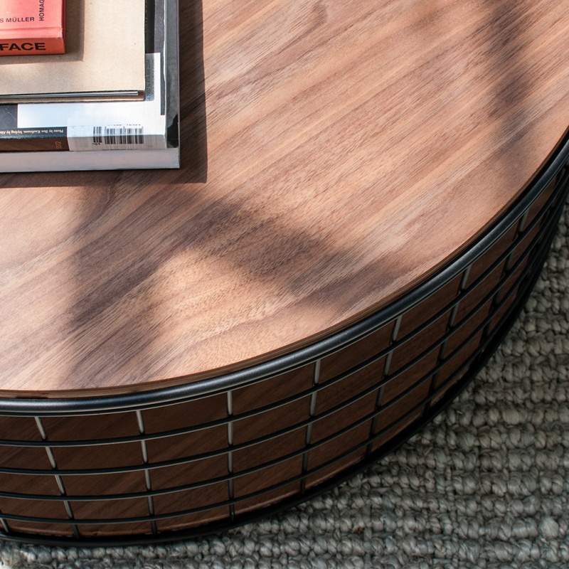 The Wireframe Coffee Table by Gus Modern is a functional accent piece which evokes the 3D wireframe models used by designers and animators. It features a walnut-finished, exposed ply top and bottom surface, and black, powder-coated steel grid framework. Two openings allow for attractive storage of cushions, blankets, books, or clutter.