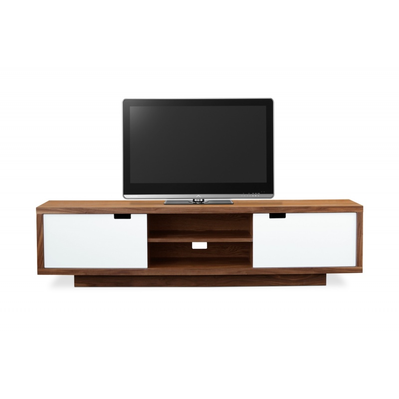 Designed for the modern entertainment room, this storage design mixes a warm, walnut exterior with white lacquer doors. Features two central cavities for component storage, a back panel opening for cable management, and self-closing doors with integrated handles.