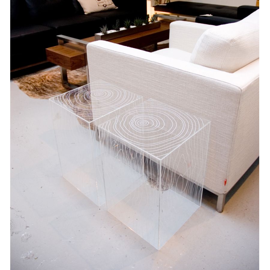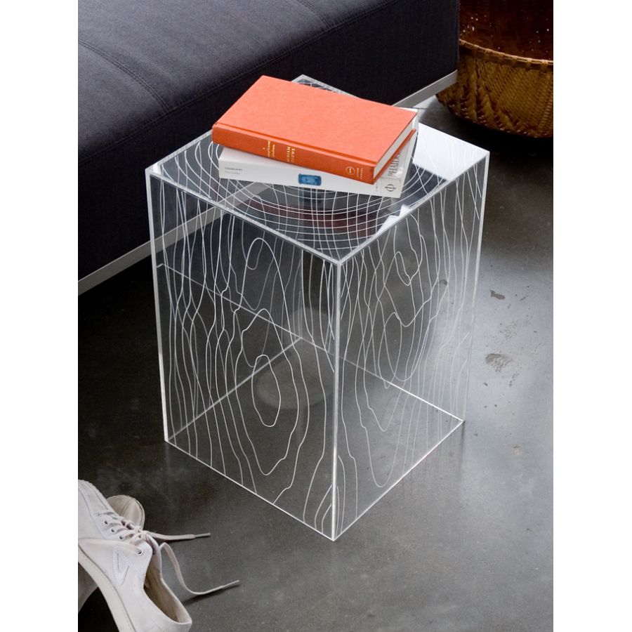 Timber Table by Gus Modern. It's all about the materials! The Timber table is a petite acrylic box minimally accented with a faux wood grain. It's not for sitting on, but used as an end table or side table, this piece of modern furniture confidently says "looks at me" without taking all the attention (or all of the space) in a room. No assembly required.