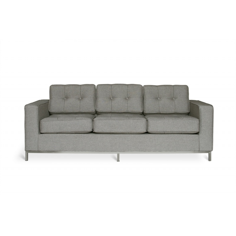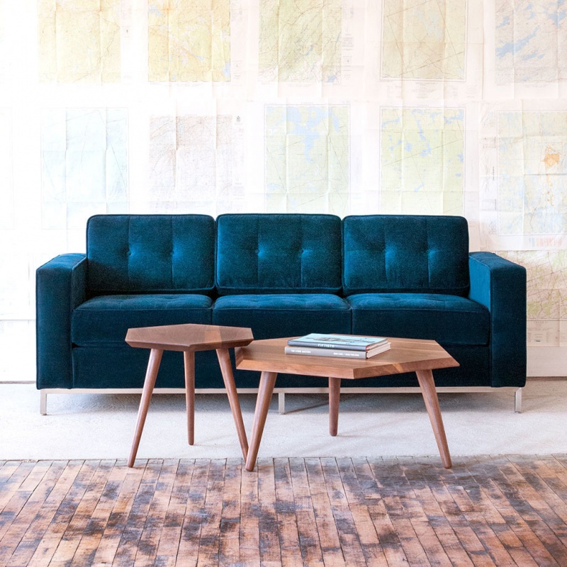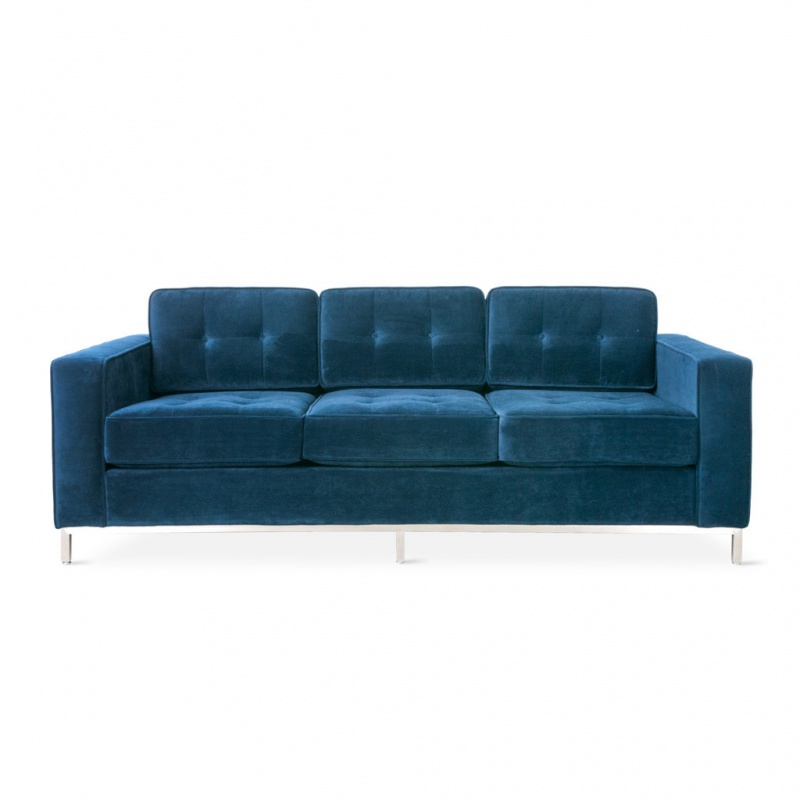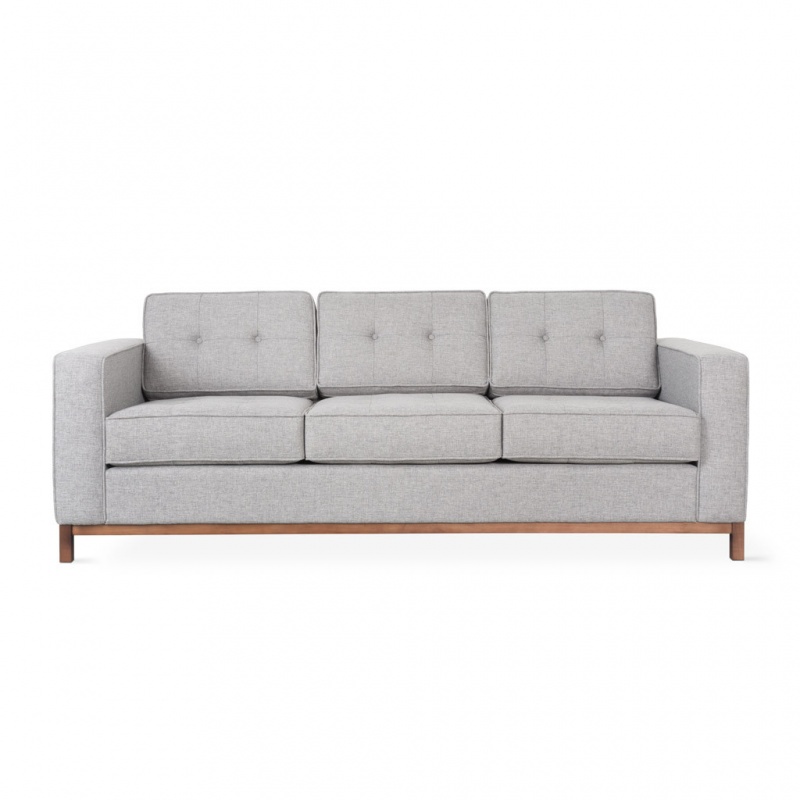 The Jane is a classic, button-tufted club sofa with a distinct Mid-Century feel. It features button-tufted cushions and choice of stainless steel or walnut finish perimeter base for all fabrics. Constructed with 100% FSC®-Certified Wood in support of responsible forest management.