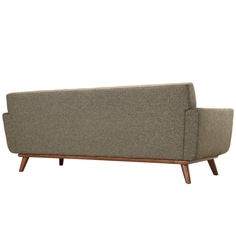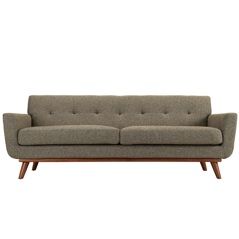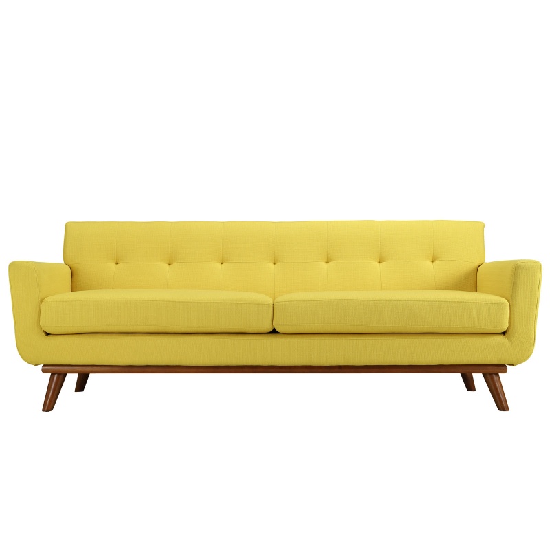 Our Vickie Sofa has gorgeous mid-century lines with modern comfort. Choose from 6 sexy colors that will fit any color pallet. Seven tufted buttons create eye catching appeal; adding depth that brings Vickie to center stage. Four cherry color rubber wood legs and frame supply a solid base to the comfortable upholstered material.