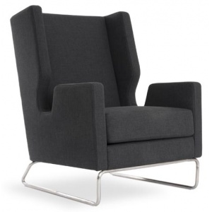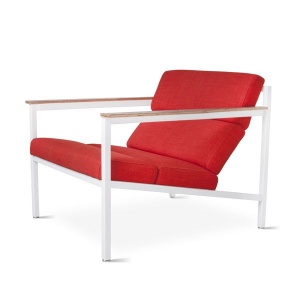 The Halifax Chair by Gus Modern is a contemporary accent chair with a laid-back, industrial feel. Faceted upholstery panels rest on a precision welded, powder-coated steel frame. Walnut-finished paddle armrests help soften the strong lines of this unique design. Upholstered panels use FSC-Certified wood products in support of responsible forest management.
