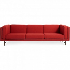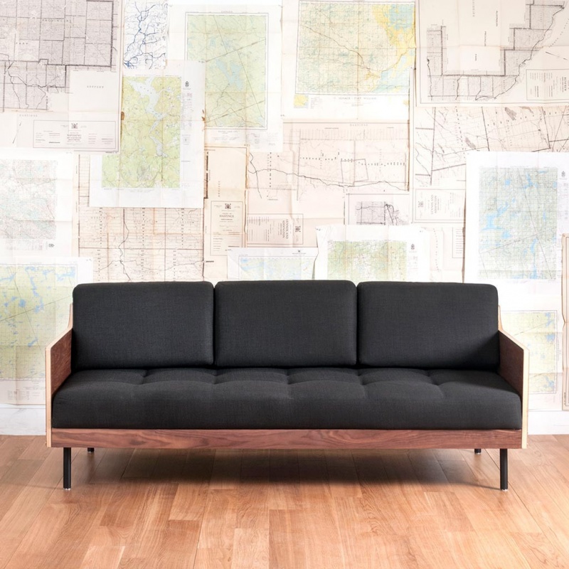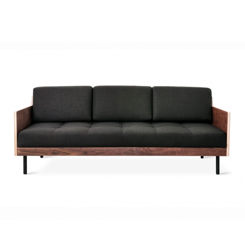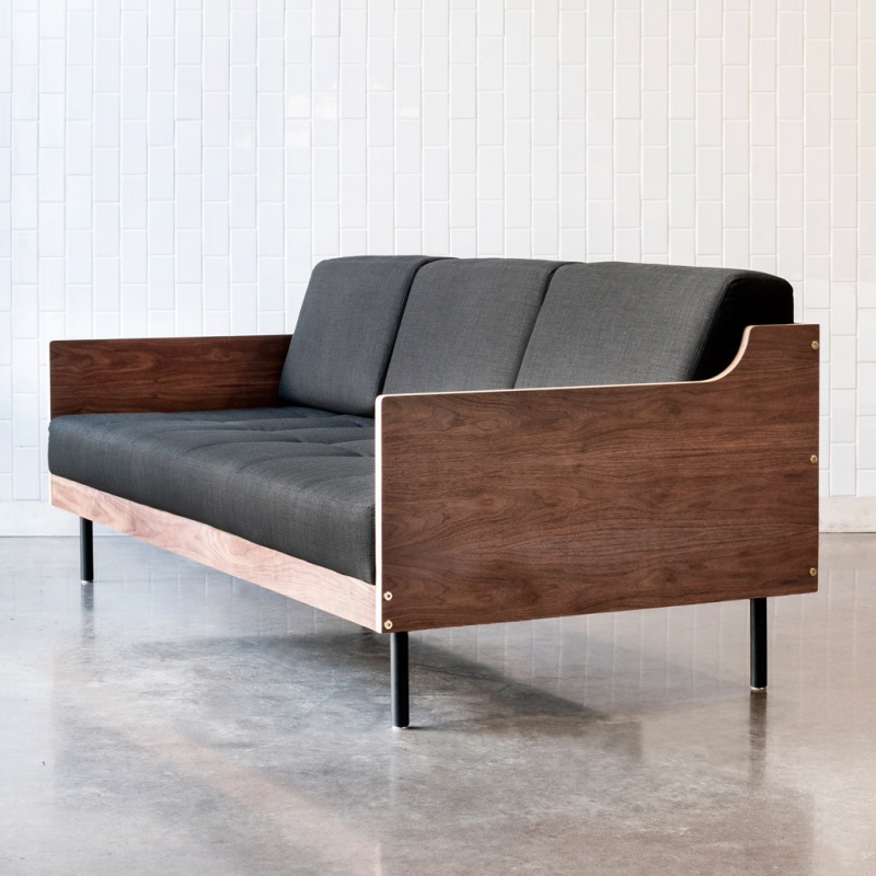 Sleek and dramatic, the Archive Sofa is a box-framed design with a strong Mid-Century influence. Walnut-finished, exposed py on all sides makes it an ideal choice for open-concept spaces. It features a blind-tufted seat, powder-coated cylindrical steel legs, and exposed brass fittings. The back cushions can be removed to convert the sofa into a daybed, for relaxing or to accomodate overnight guests. The inner frame is constructed with kiln-dried, 100% FSC®-Certified hardwood, in support of responsible forest management.