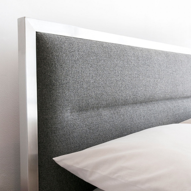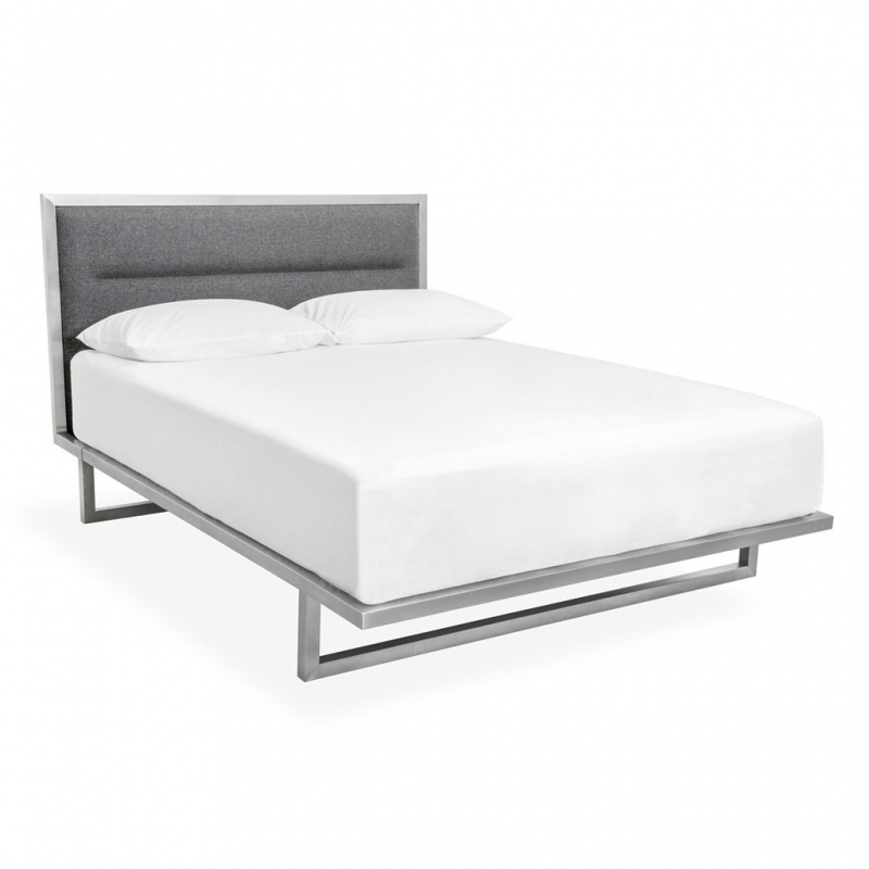 The Midway Bed features an upholstered headboard and a stainless steel perimeter frame. A horizontal channel-stitch detail in the headboard emphasizes the clean, modern lines of this design. The bed includes a compact mattress suspension system which eliminates the need for a box spring. Available in Queen and King sizes.